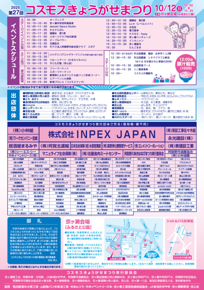 ステージイベントでは、ゲストにラッパーKONG、fuzzyやバルーンパフォーマーひまわりちゃん、ジャグラードミノ、インカニャンによるパフォーマンスの他、各団体によるダンスや演舞など目白押しです!