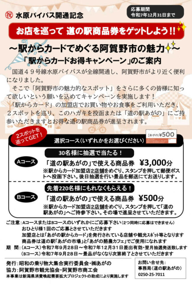 駅からカードの2スポットを巡ると3,000円分の道の駅あがのの商品券(抽選)または500円分の道の駅あがのの商品券(先着)がもらえます。